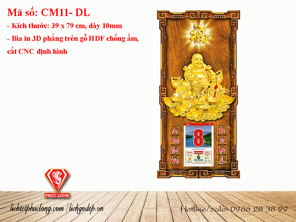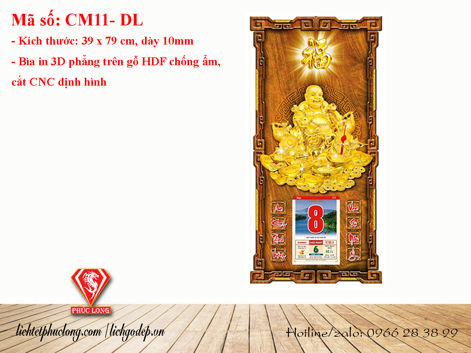 - Kích thước bìa lịch (chuẩn phong thuỷ): 39 x 79cm, cắt định hình bằng máy CNC