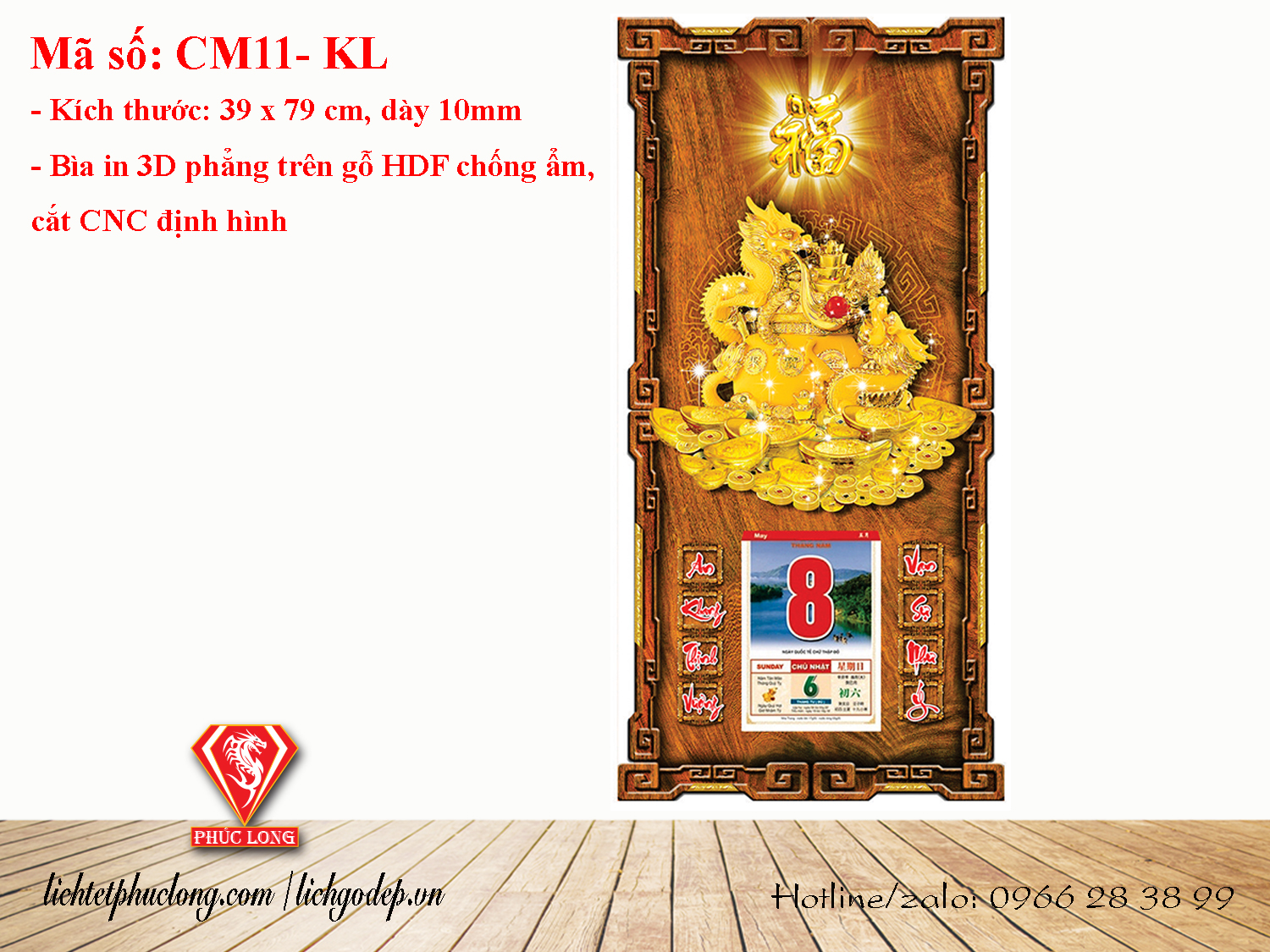 - Kích thước bìa lịch (chuẩn phong thuỷ): 39 x 79cm, cắt định hình bằng máy CNC