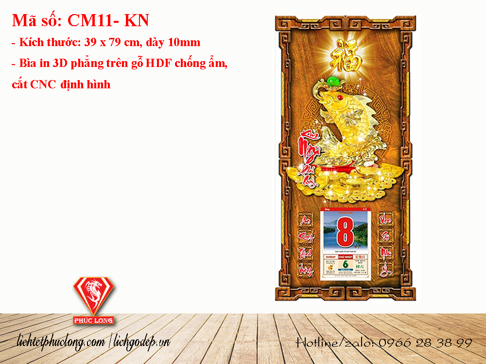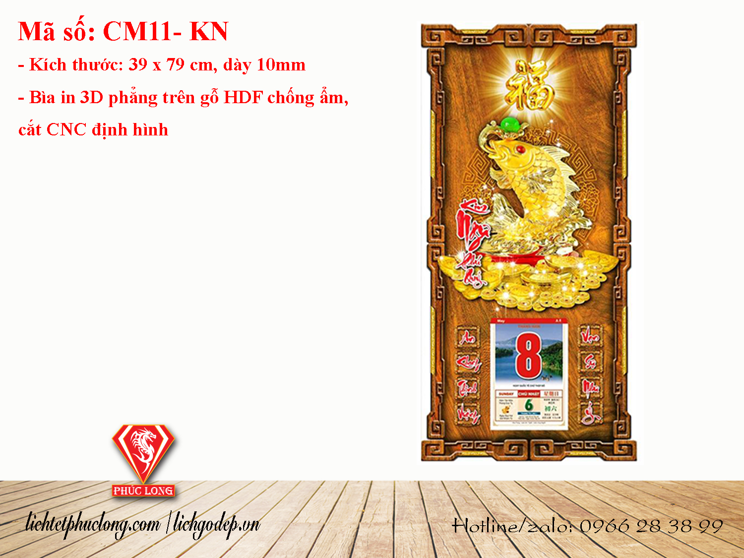- Kích thước bìa lịch (chuẩn phong thuỷ): 39 x 79cm, cắt định hình bằng máy CNC